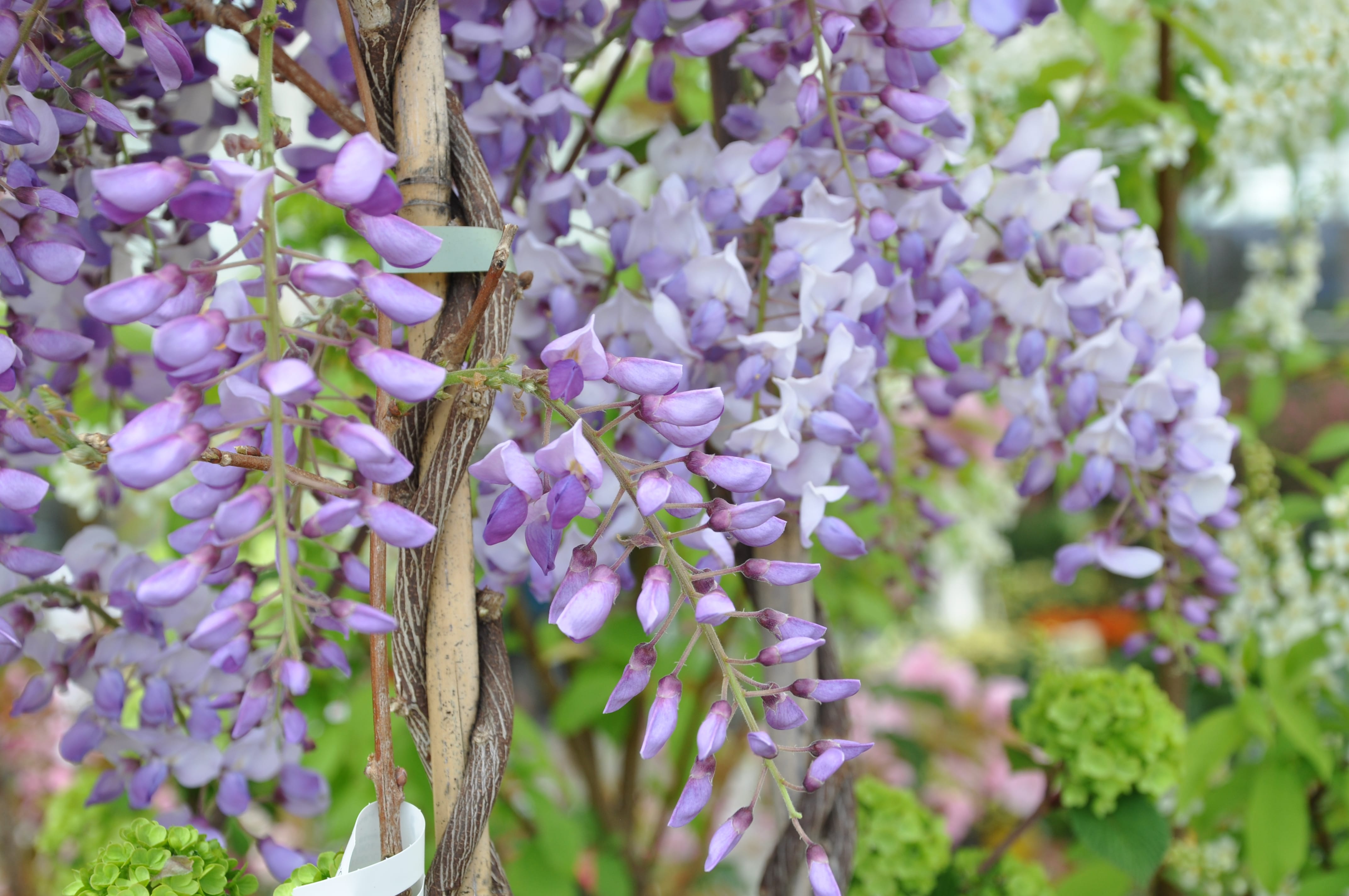 Nur wenn nötig, die Triebe im Strauch oder am Klettergerüst verteilen, leiten oder locker aufbinden. Am besten am frühen Morgen, wenn sie noch taunass sind. Clematis lieben es nicht, bei warmem Wetter berührt zu werden. Muss man sie entwirren, brechen die Triebe rasch, dies zerstört die Kapillarität, sie welken.